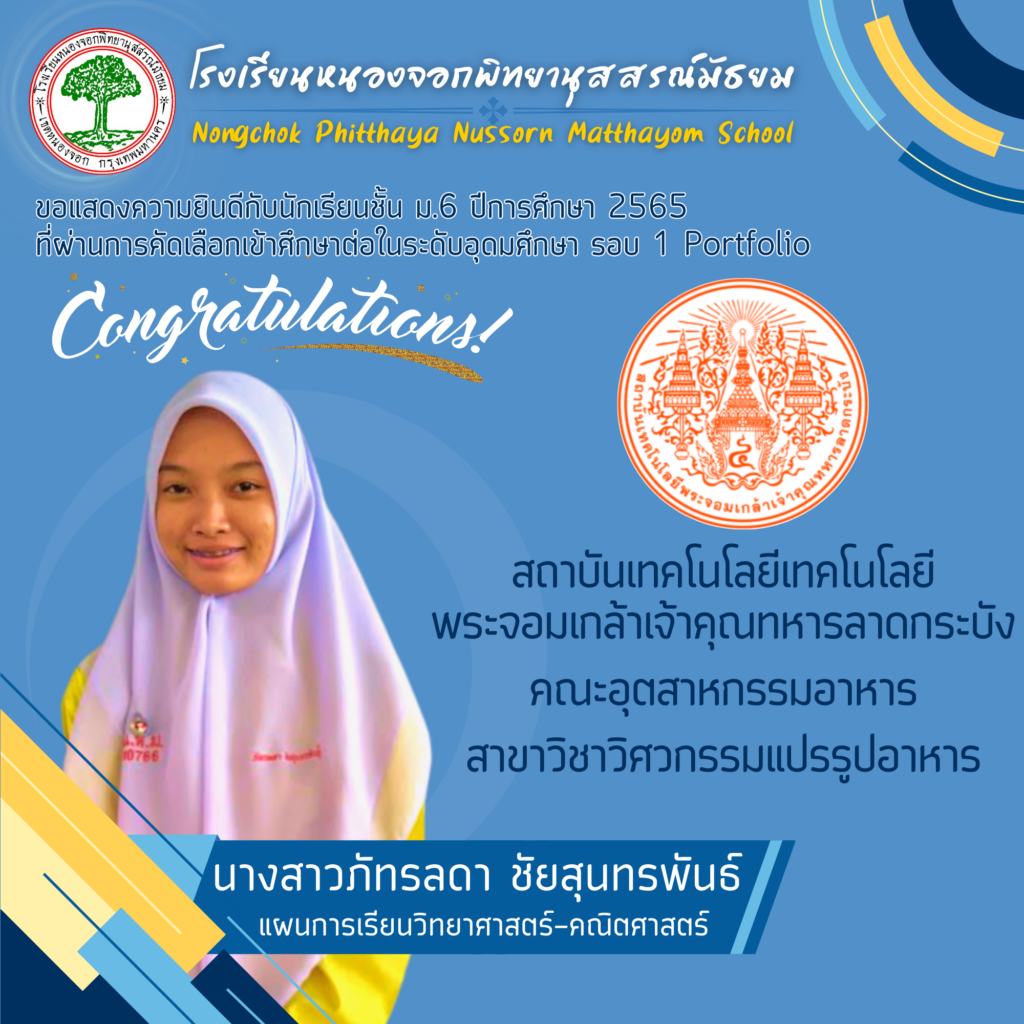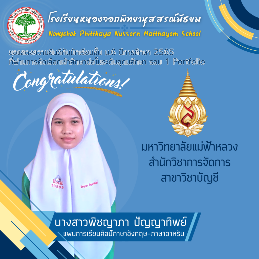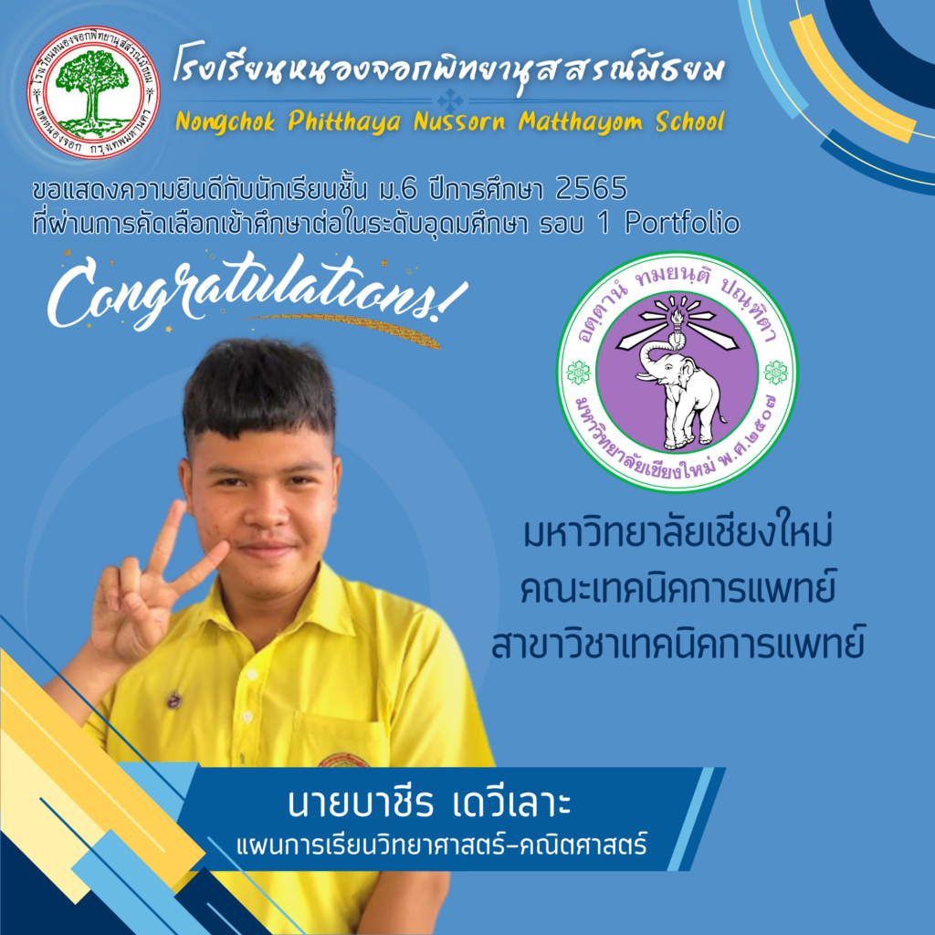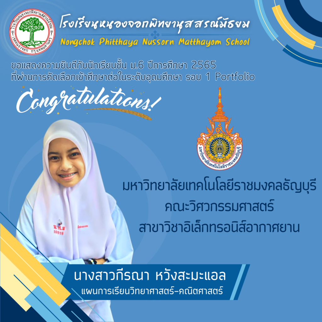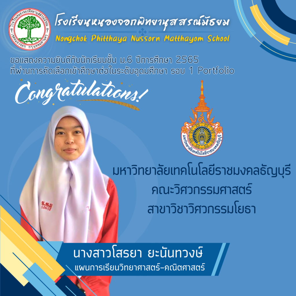 โรงเรียนหนองจอกพิทยานุสสรณ์มัธยม ขอแสดงความยินดีกับนักเรียนระดับชั้นมัธยมศึกษาปีที่ 6 ปีการศึกษา 2565 จำนวน 59 คน ที่สามารถสอบผ่านการคัดเลือกเข้าศึกษาต่อในระดับอุดมศึกษาในกำกับของรัฐ ระบบ TCAS รอบที่ 1 รอบ Portfolio ซึ่งระบบ TCAS คือ ระบบการคัดเลือกกลางบุคคลเข้าศึกษาในสถาบันอุดมศึกษา ซึ่งนักเรียนสามารถยื่นความประสงค์ขอคัดเลือกได้ 4 รอบ ประกอบด้วย แบบที่1 แฟ้มสะสมผลงาน (Portfolio) แบบที่2 โควตา (Quota) แบบที่3 รอบแอดมิชชั่น (Admission) แบบที่4 รับตรงอิสระ (Direct Admission)