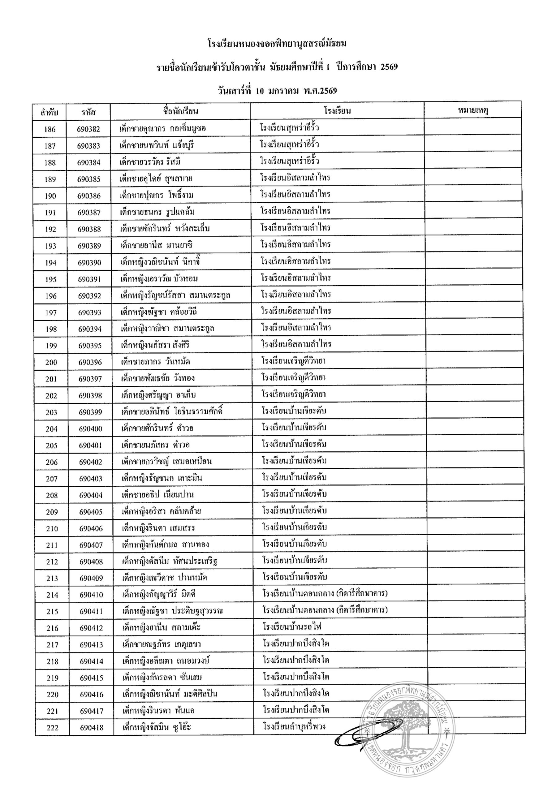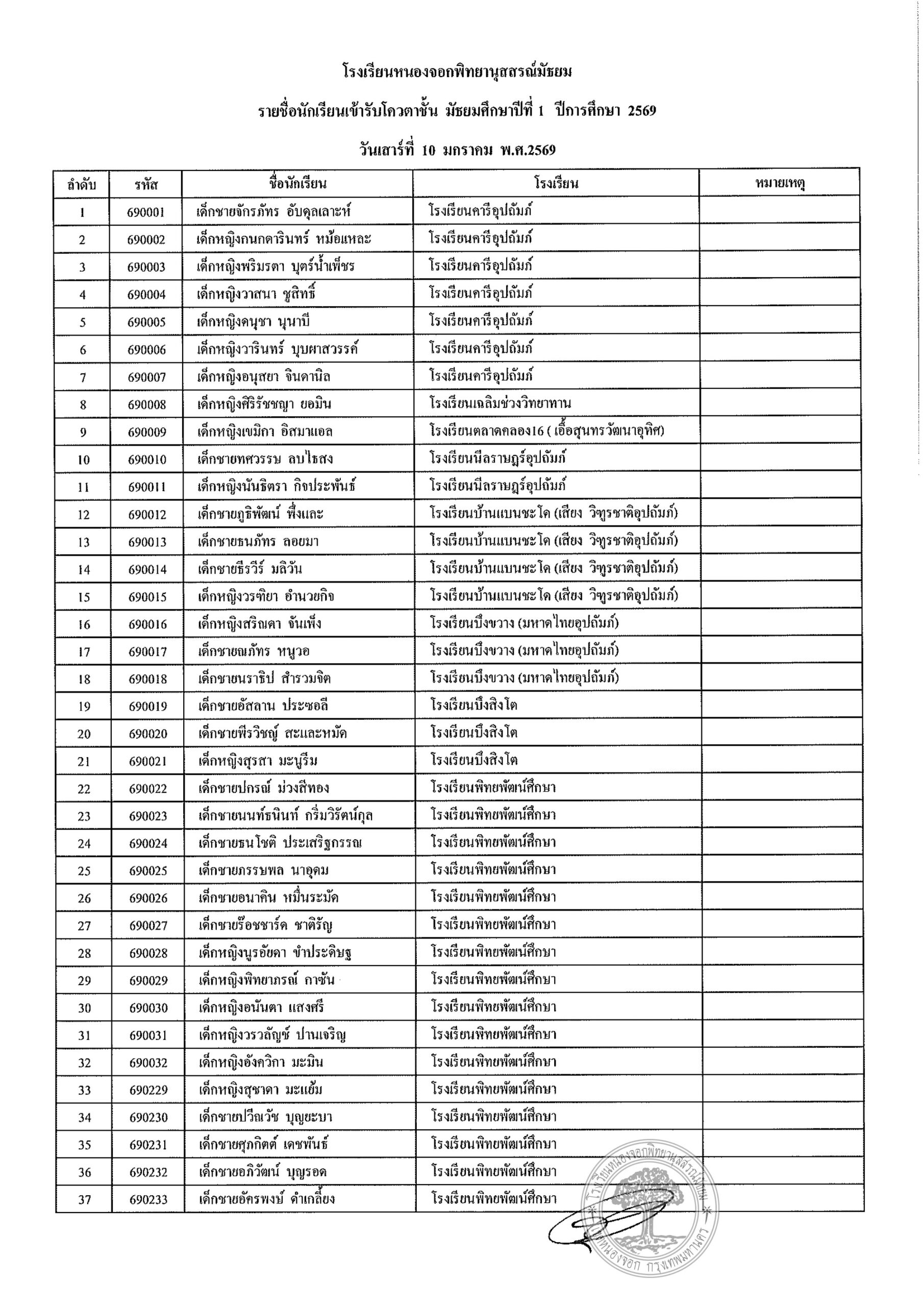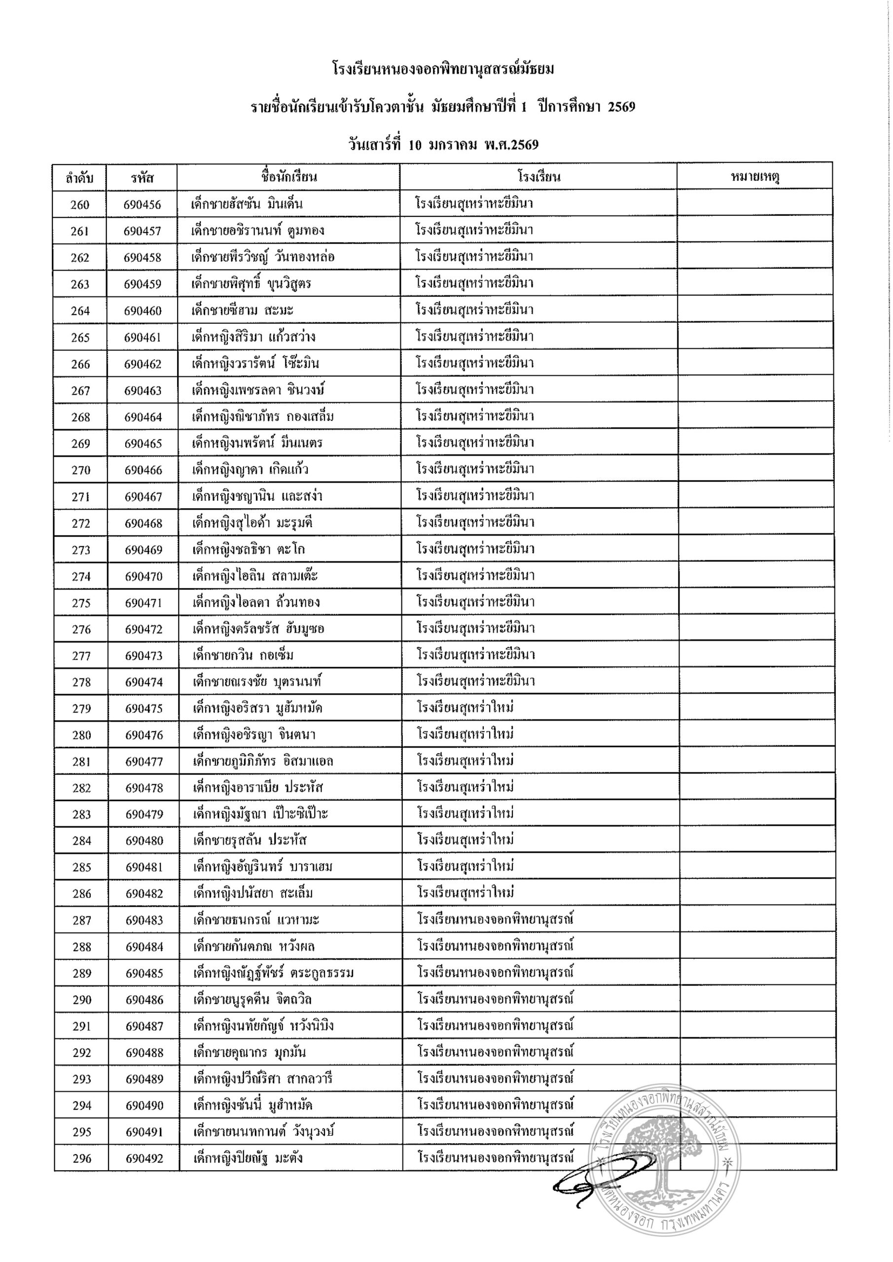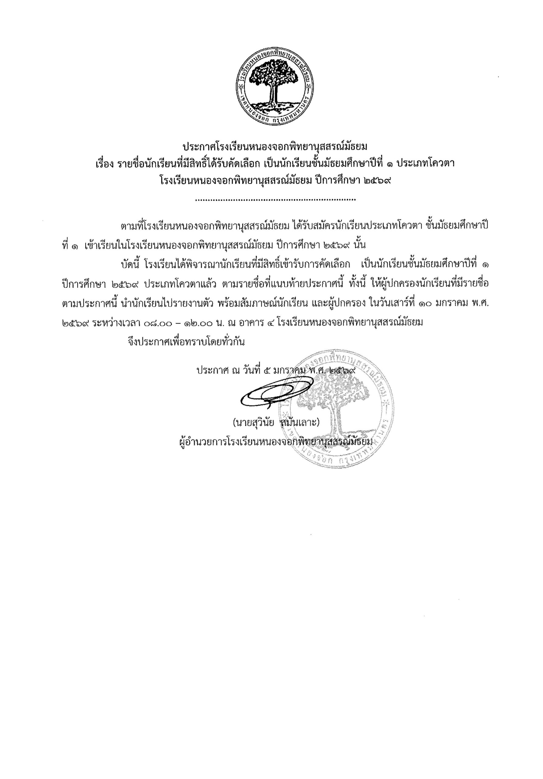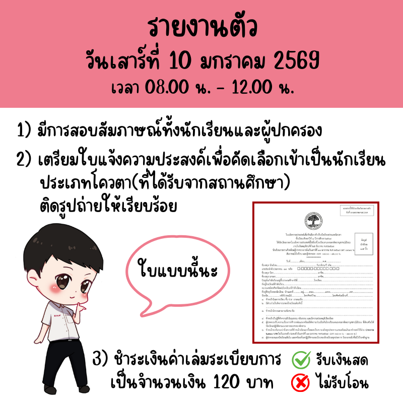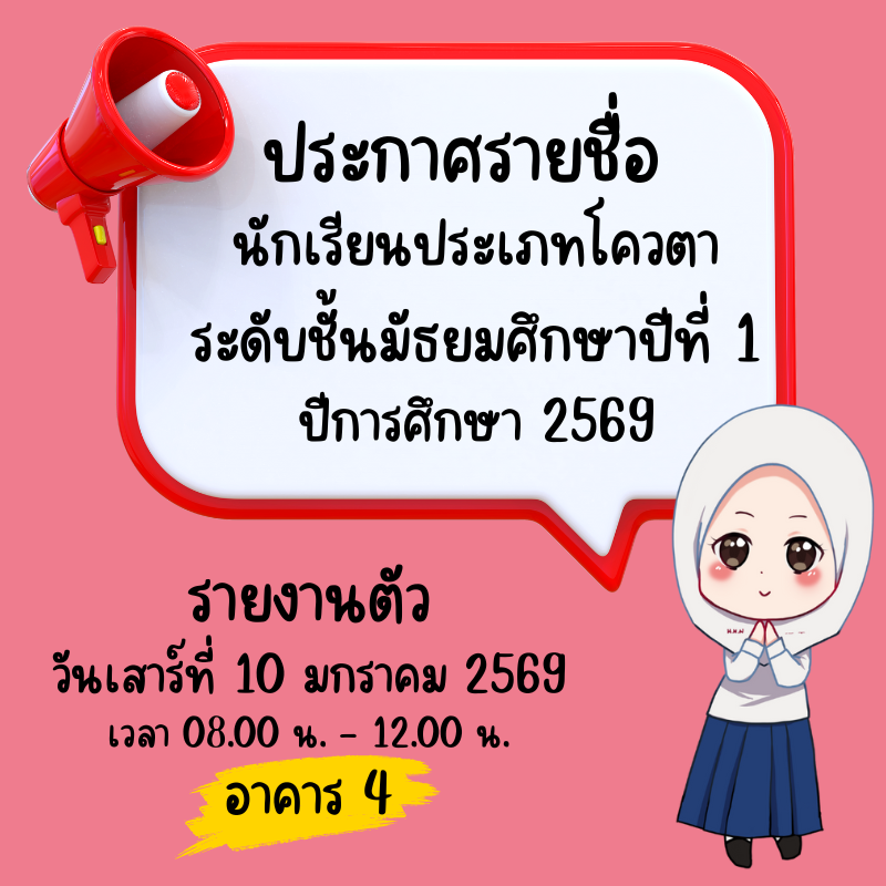 ประกาศรายชื่อนักเรียนประเภทโควตา ระดับชั้นมัธยมศึกษาปีที่ 1 ปีการศึกษา 2569รายงานตัววันเสาร์ที่ 10 มกราคม 2569 เวลา 08.00 น. – 12.00 น. (ปิดรับลงทะเบียน 11.30 น.)ณ อาคาร 4 โรงเรียนหนองจอกพิทยานุสสรณ์มัธยม นักเรียนต้องมาพร้อมผู้ปกครอง ***มีค่าใช้จ่าย***ค่าเล่มระเบียบการ 120 บาท(หนึ่งร้อยยี่สิบบาทถ้วน) ***ไม่รับโอน***รบกวนเตรียมมาให้พอดี