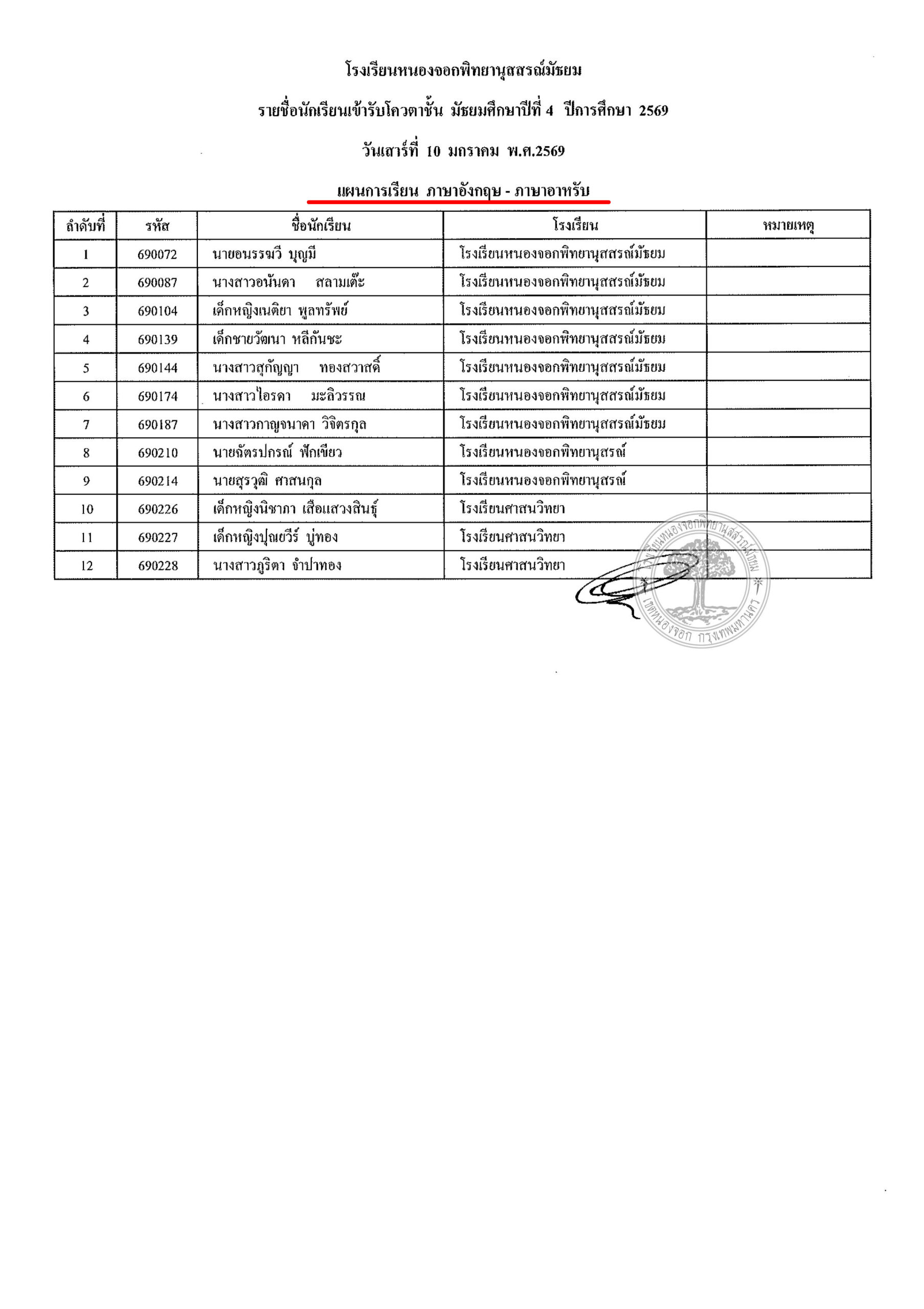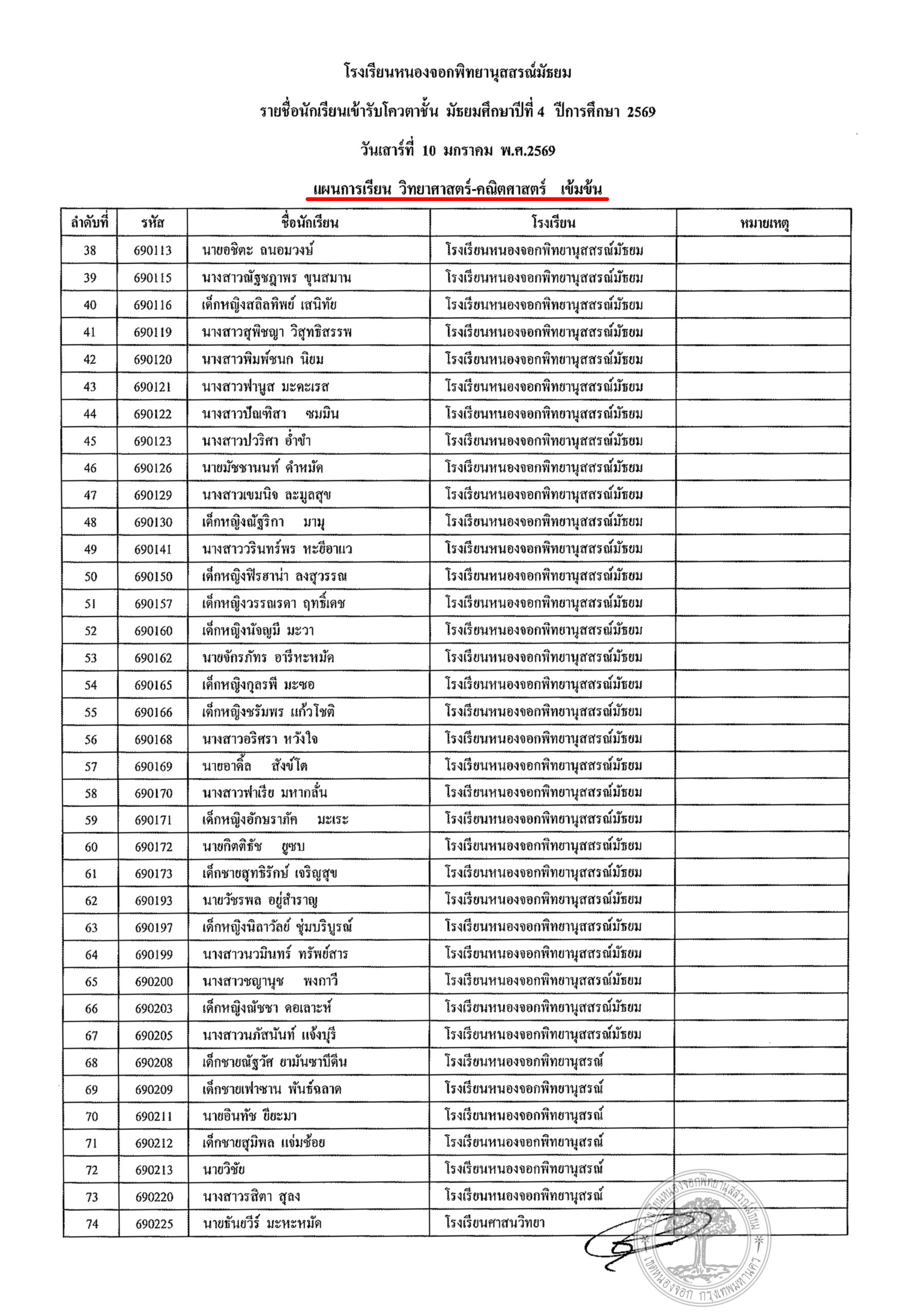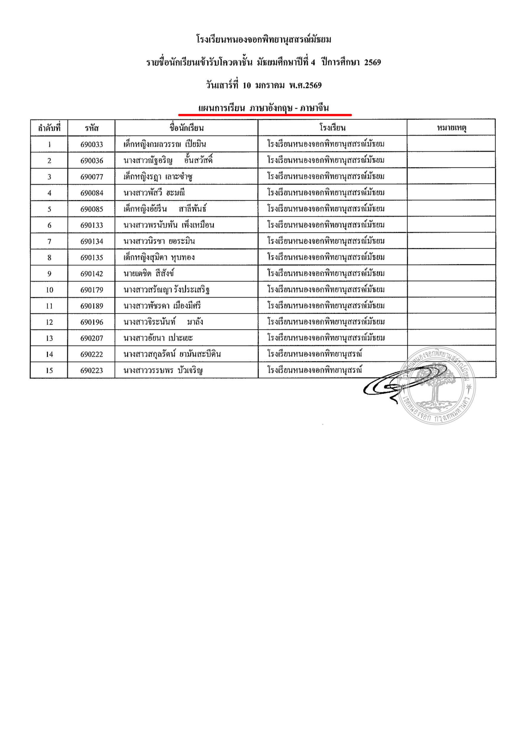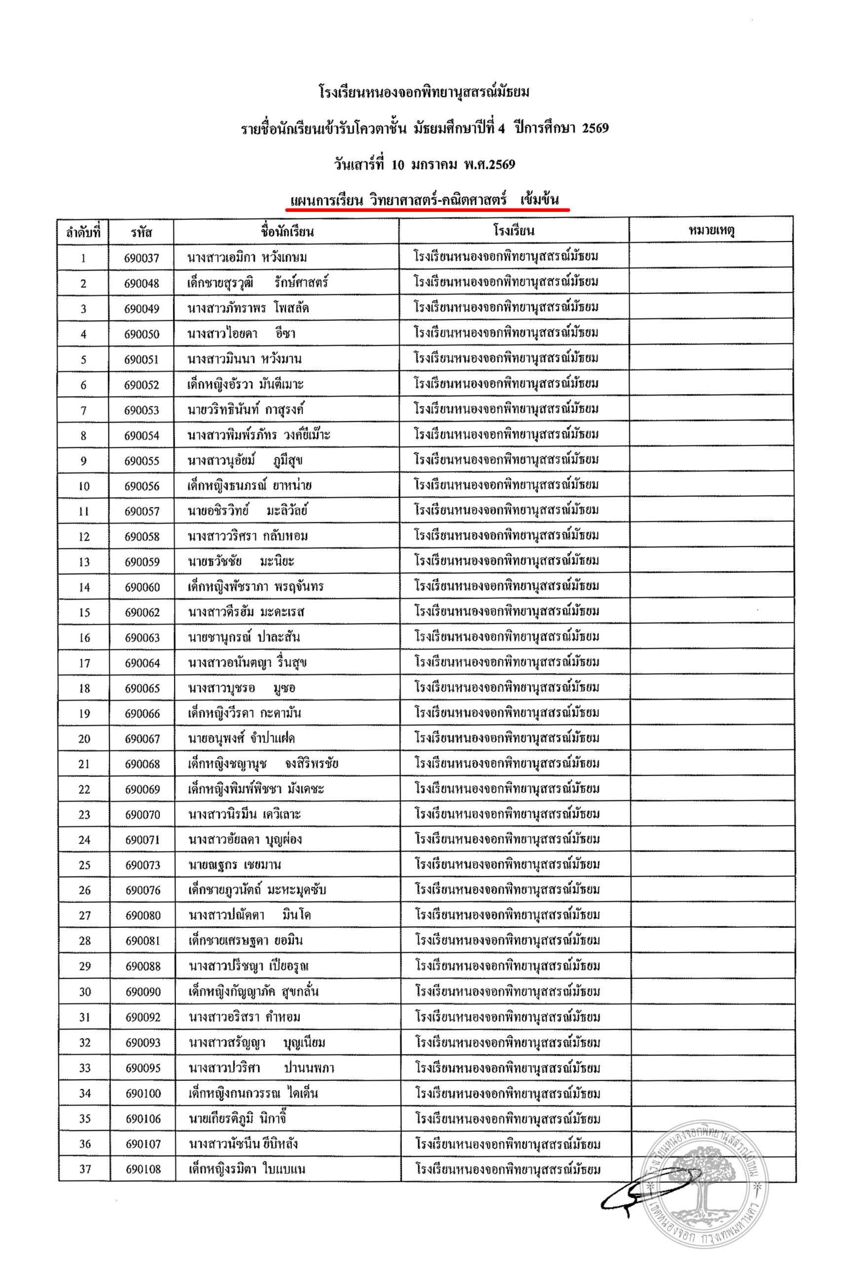 ประกาศรายชื่อนักเรียนประเภทโควตา ระดับชั้นมัธยมศึกษาปีที่ 4 ปีการศึกษา 2569
