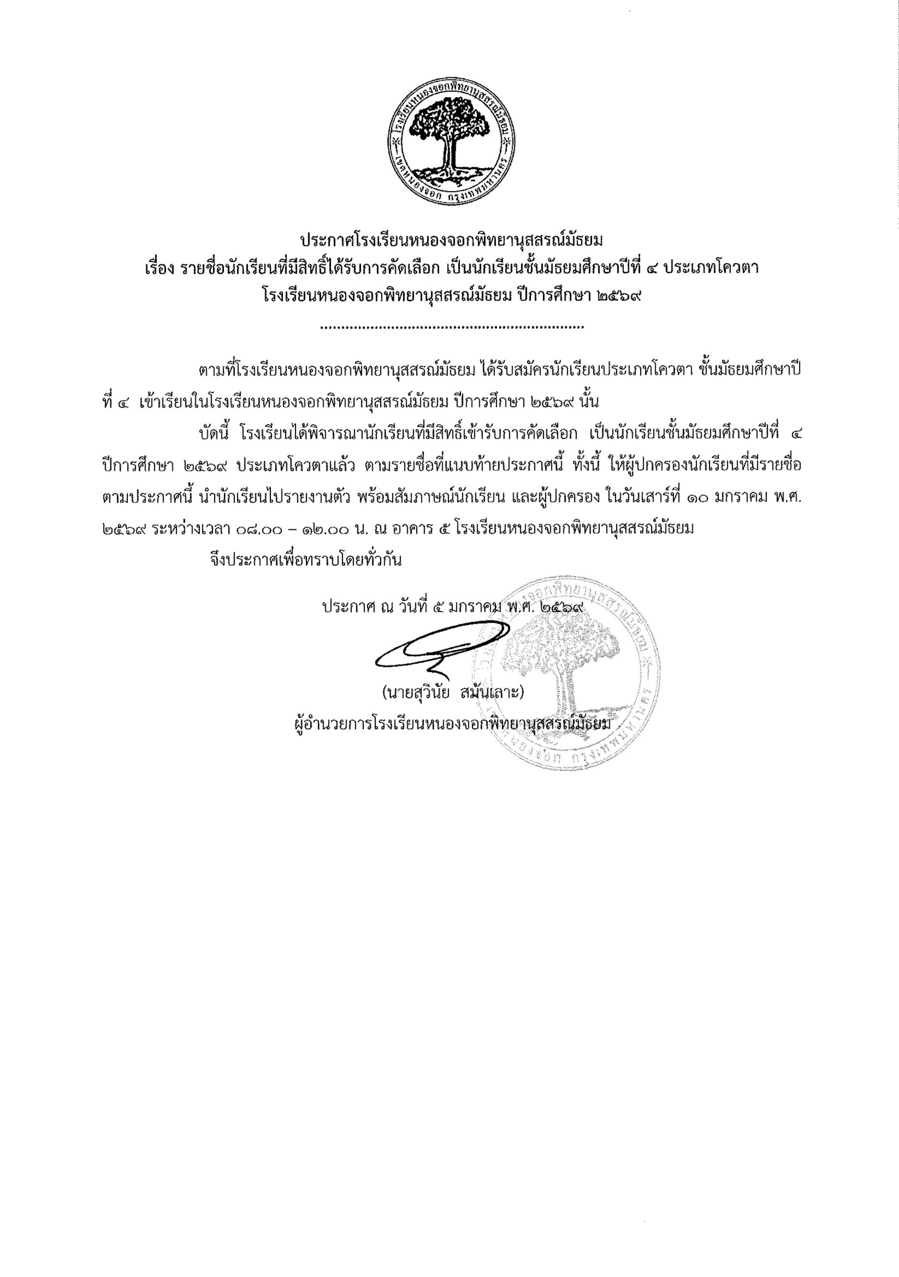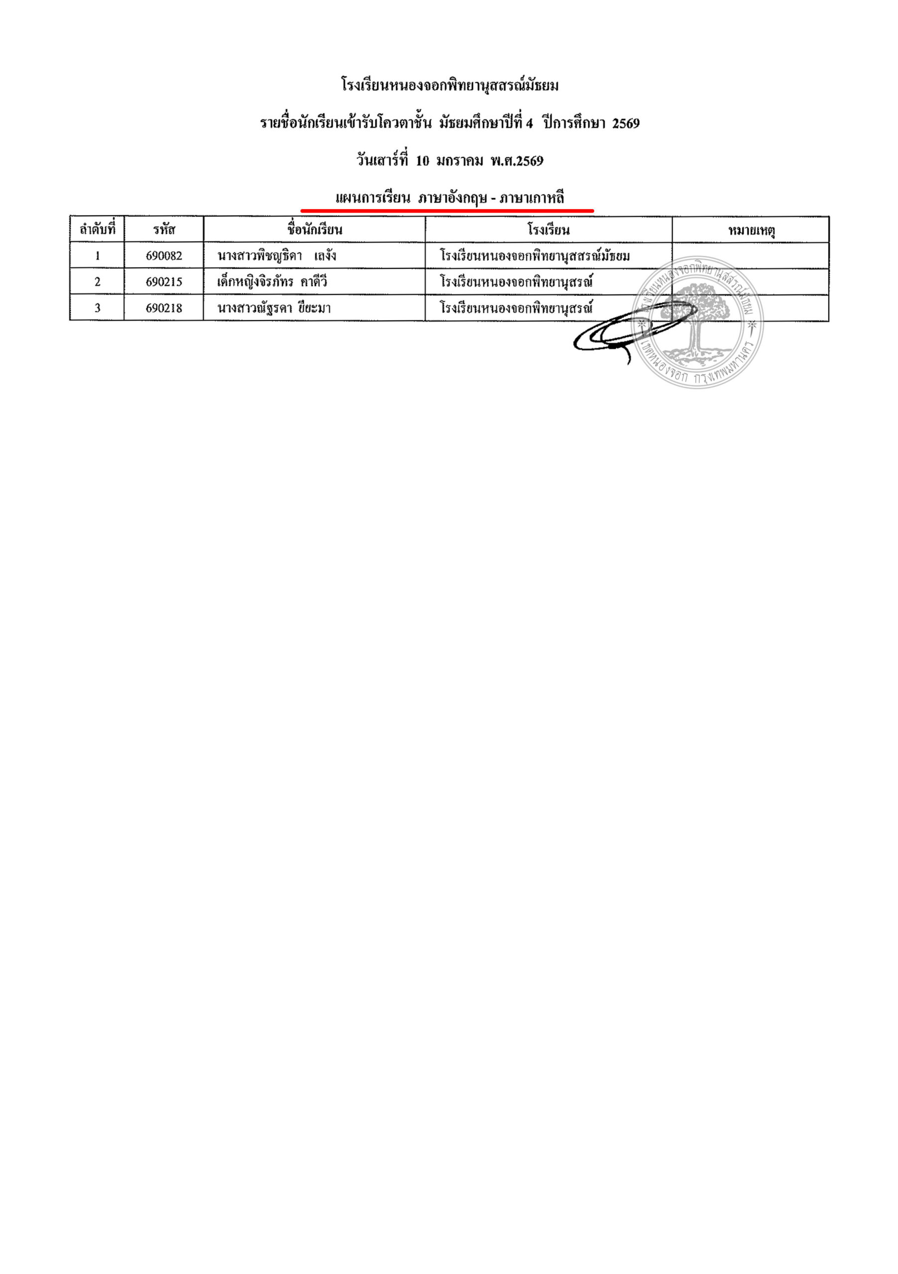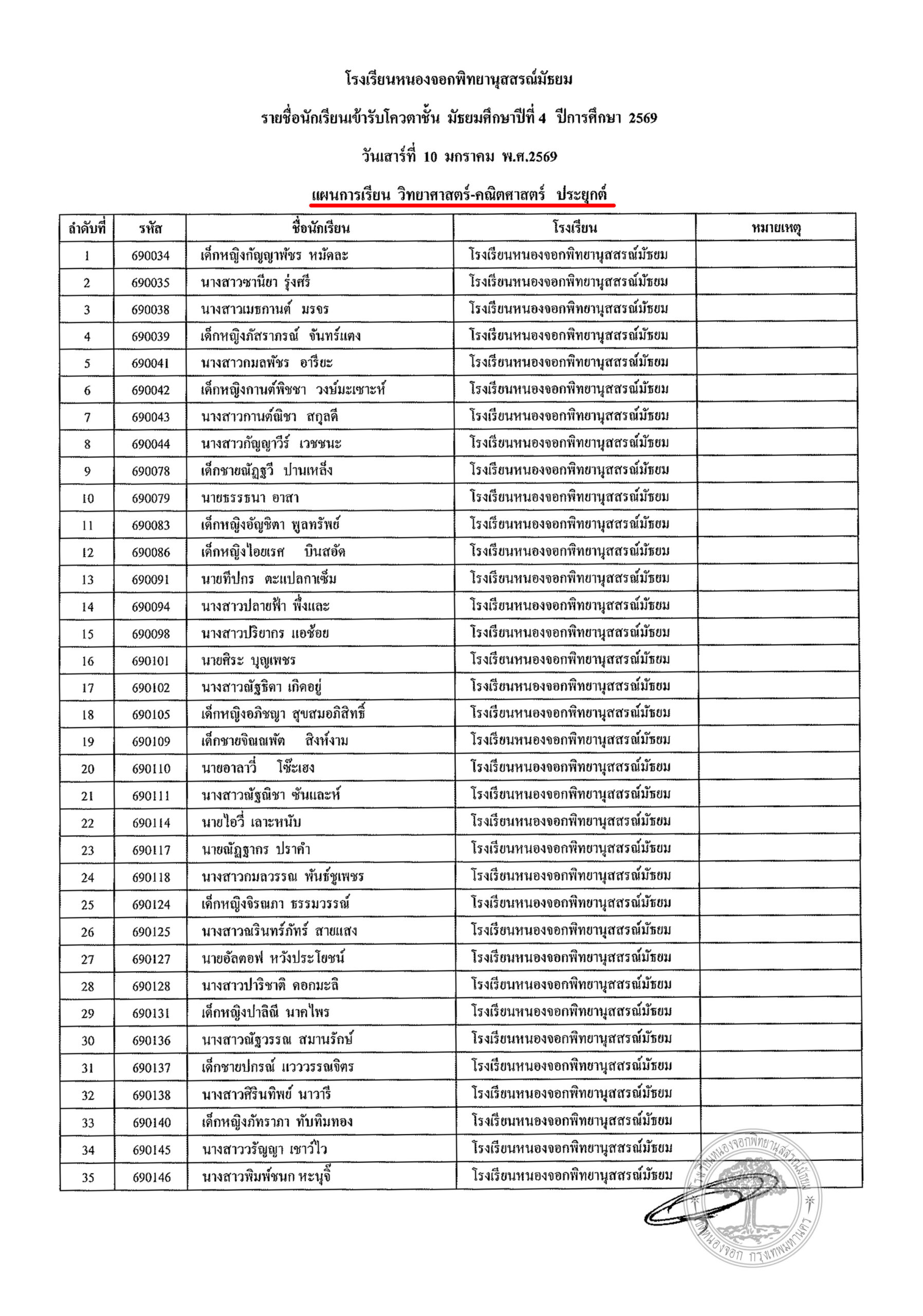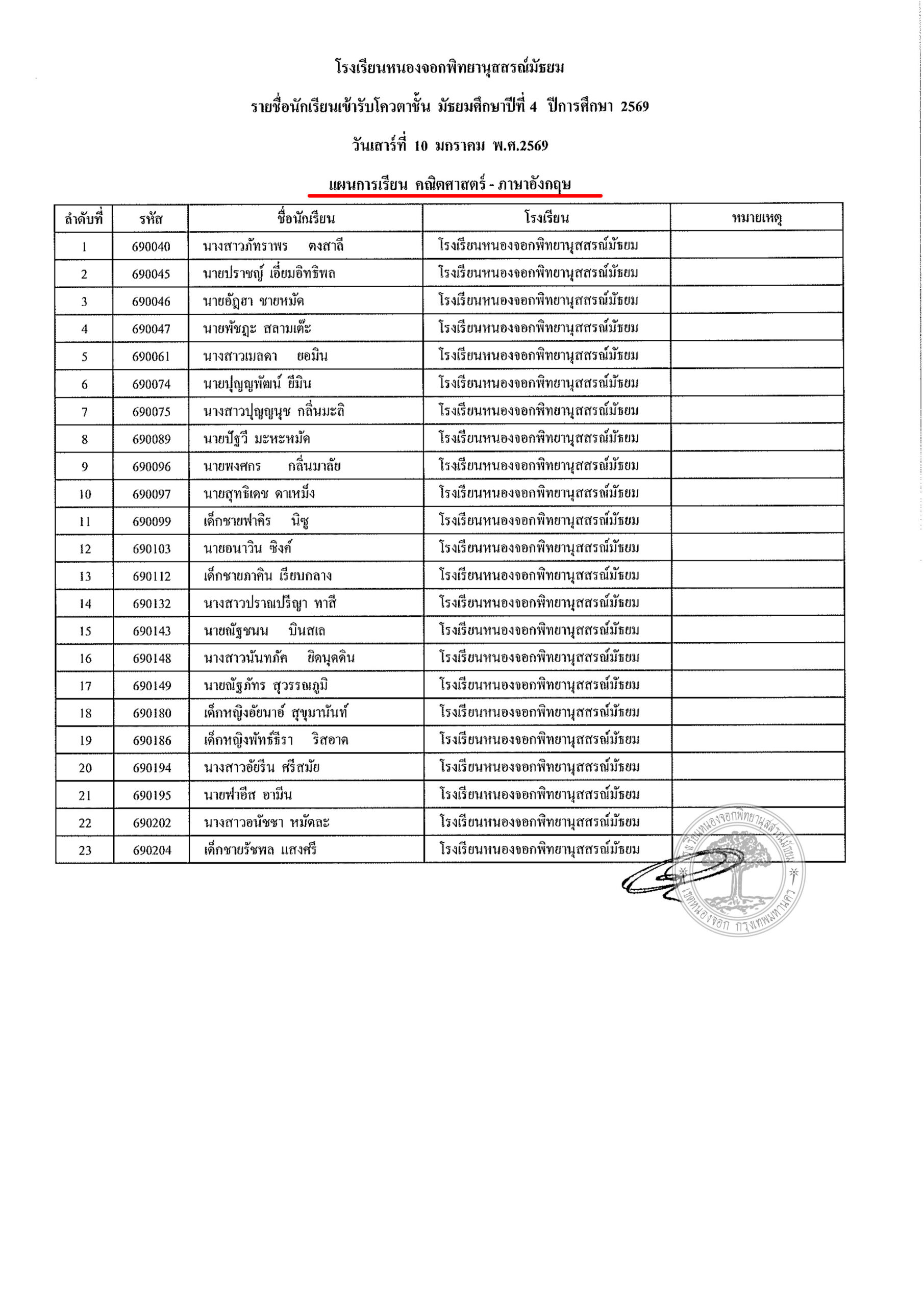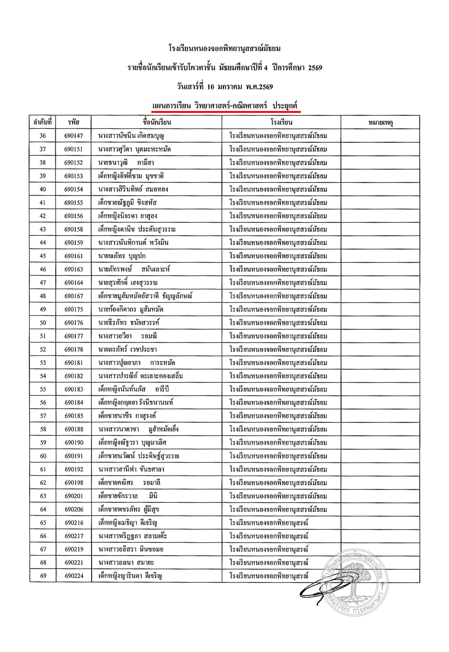 ประกาศรายชื่อนักเรียนประเภทโควตา ระดับชั้นมัธยมศึกษาปีที่ 4 ปีการศึกษา 2569