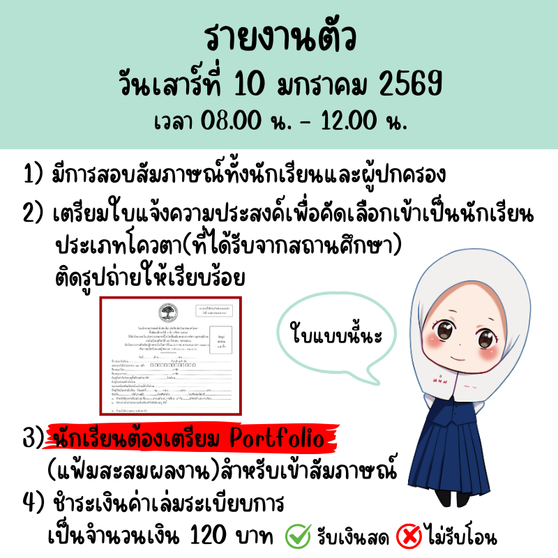 ***อย่าลืม! เตรียม Portfolio มาด้วยนะ***นักเรียนต้องมาพร้อมผู้ปกครอง