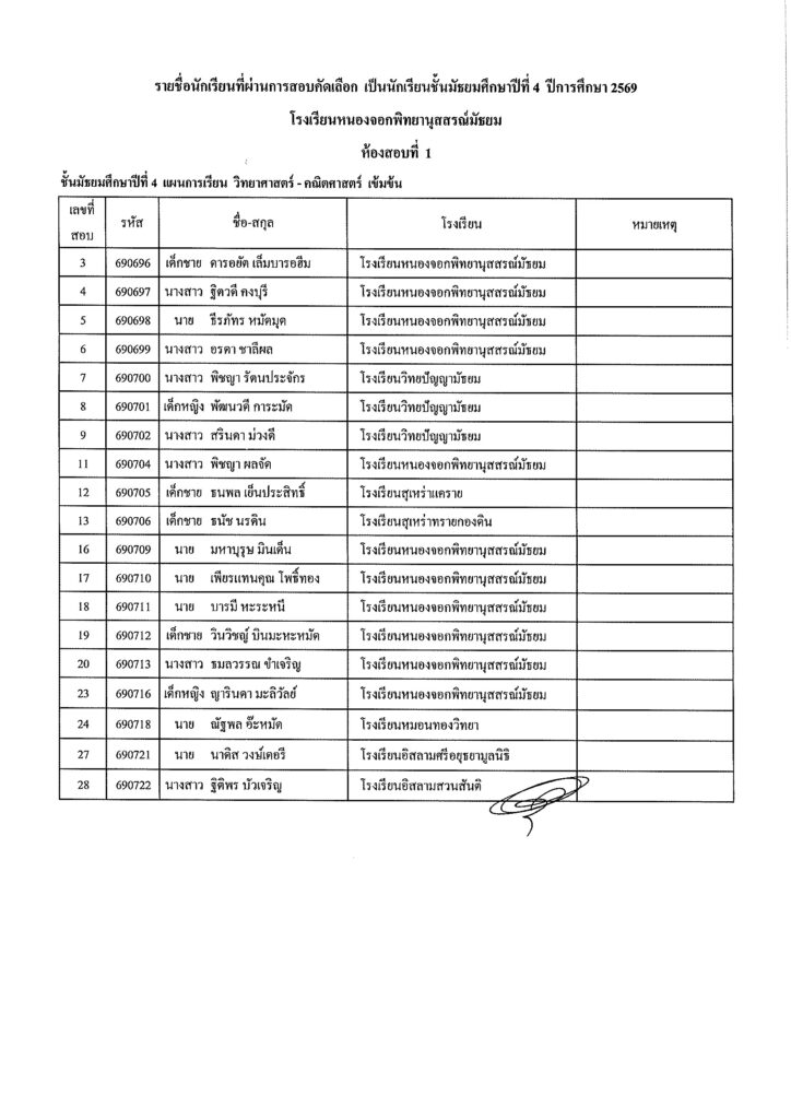 นักเรียนที่สอบผ่านการคัดเลือก เป็นนักเรียนระดับชั้นมัธยมศึกษาปีที่ 1 โรงเรียนหนองจอกพิทยานุสสรณ์มัธยม ปีการศึกษา 2569 ต้องทำการมอบตัวและวัดเครื่องแบบนักเรียน พร้อมชำระค่าธรรมเนียมการศึกษา ในวันอาทิตย์ที่ 15 กุมภาพันธ์ 2569 เวลา 08.00 น. – 12.00 น.